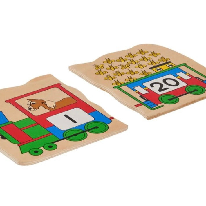 Each box contains 20 wooden puzzle pieces with numbers printed on them. All that is required is to assemble the pieces in ascending order to complete the number train.