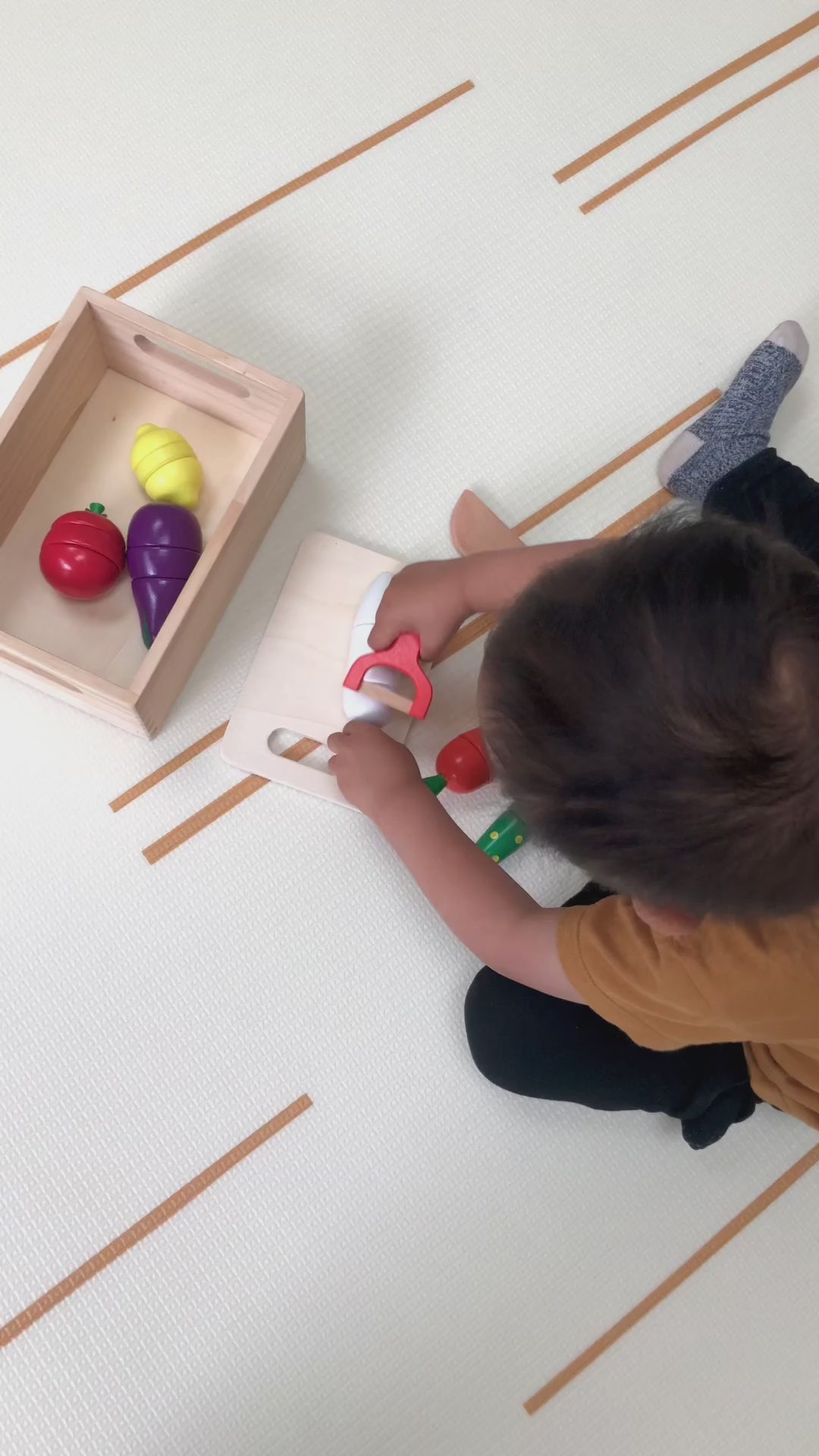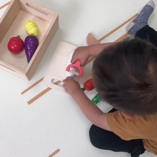 - Includes wooden veggies, knife, peeler, cutting board and storage box